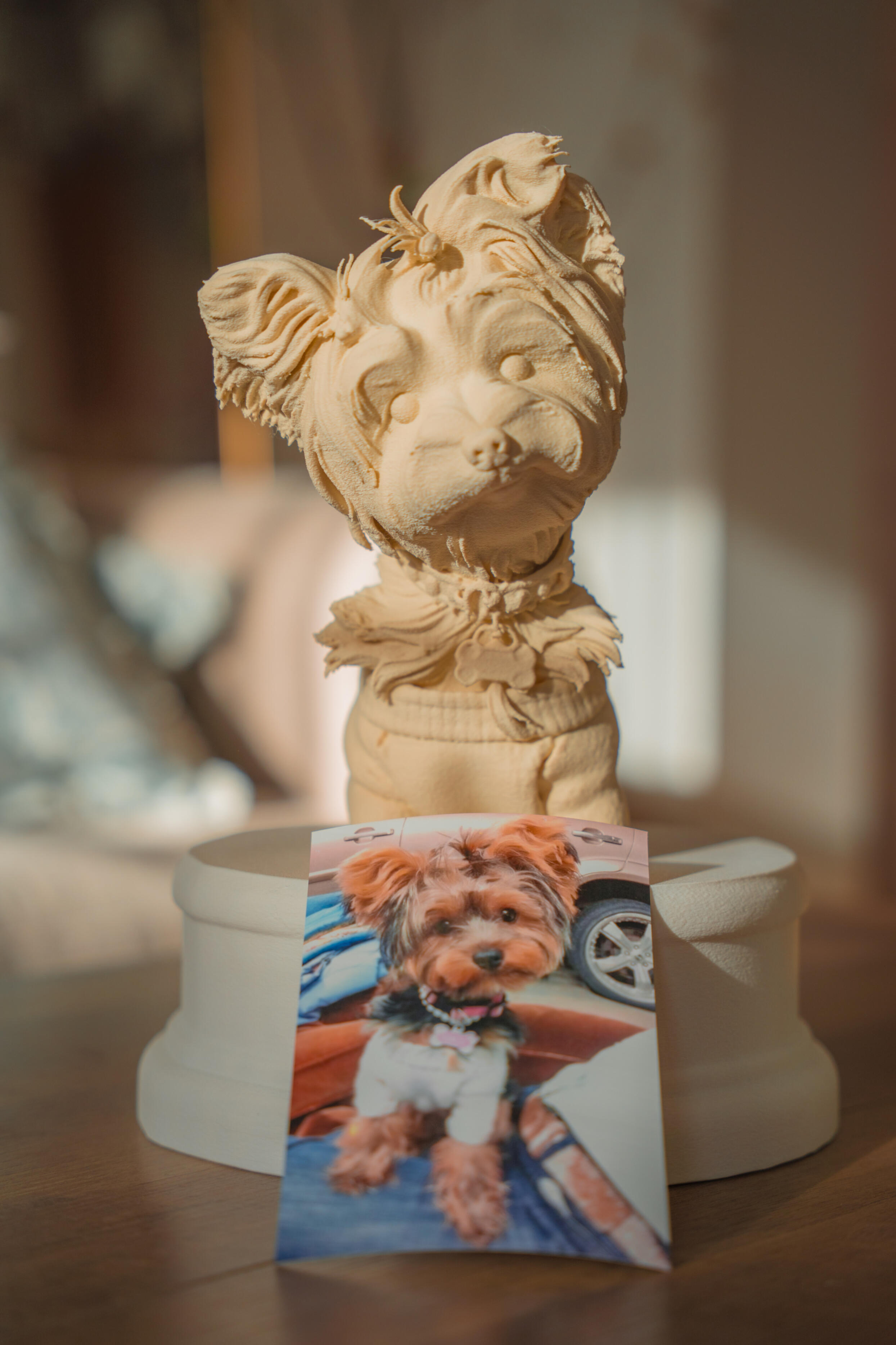 A large, lifelike memorial sculpture created from your pet’s photos. With a hidden resting place and a simple tap to relive their memories.